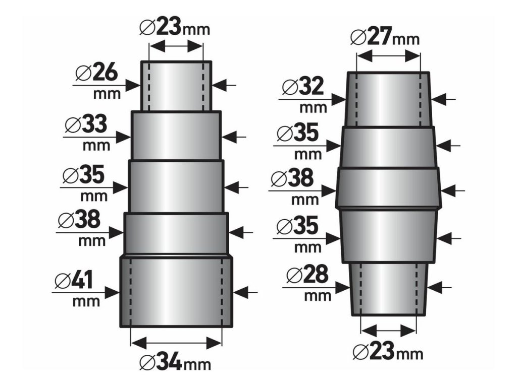 - Vonkajšie priemery: 32 mm, 35 mm, 38 mm, 40 mm, 28 mm, 23 mm