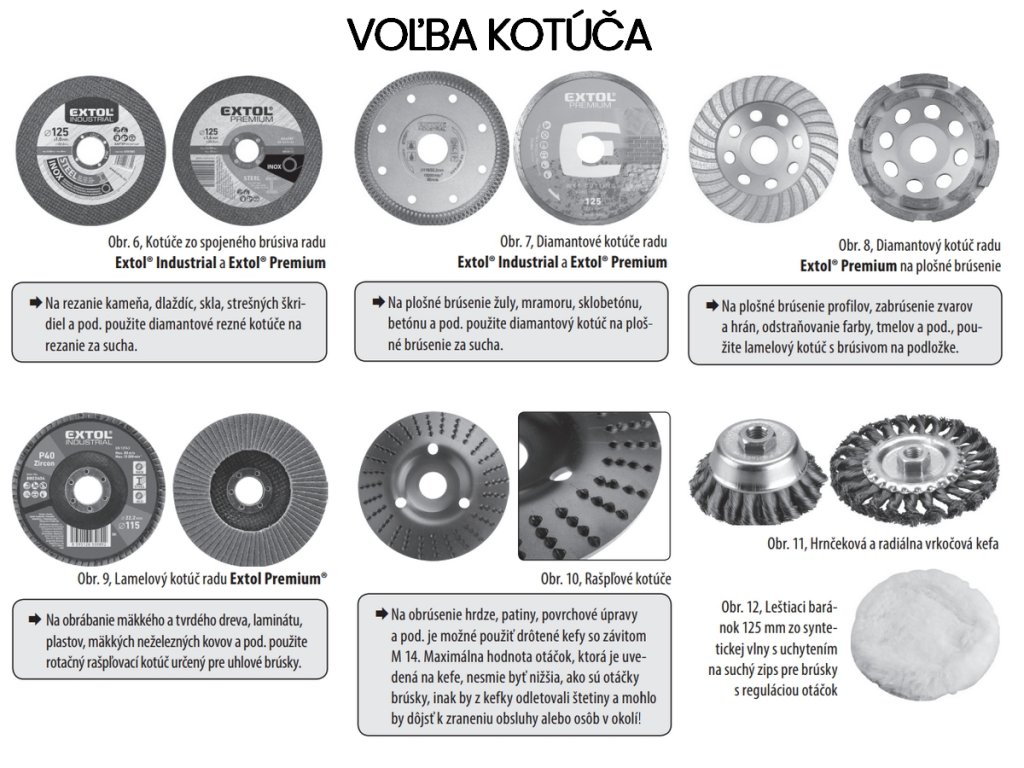 Rezne, lamelové, diamantové, drôtené aj rašpľové kotúče so závitom M14 a priemerom 125 mm.