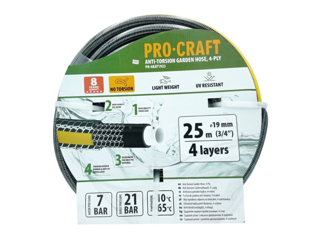 Záhradná hadica Procraft PR-4KAT1925 predstavuje základný prvok pre každého, kto potrebuje spoľahlivo distribuovať vodu po svojom pozemku. Štvorvrstvová konštrukcia z kvalitného PVC zaisťuje, že hadica drží svoj tvar aj pri plnom prietoku vody bez nežiaduceho krútenia.