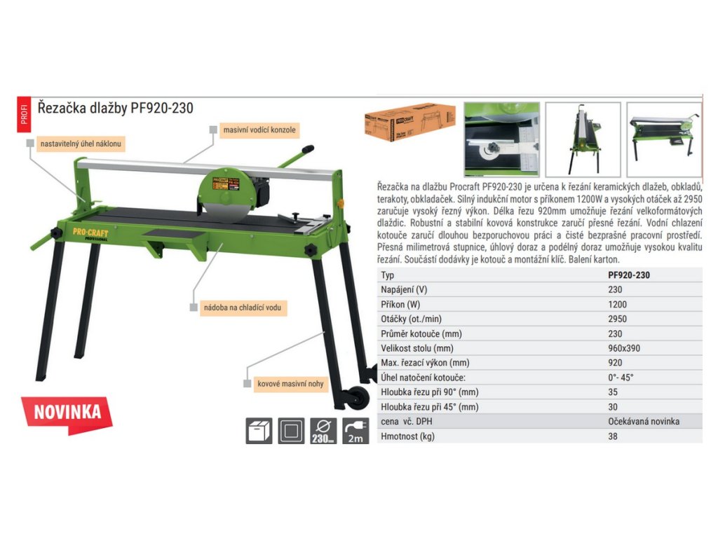 Pri štandardnom nastavení pod uhlom 90° dosahuje maximálna hĺbka rezu hodnotu 35 mm, čo postačuje pre väčšinu bežných dlažieb a obkladov. - Obsahuje balenie rezačky PROCRAFT PF920-230 aj rezný kotúč?