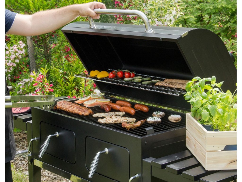 Oceľová konštrukcia s čiernym práškovým nástrekom a ohňovzdorným náterom zaručuje dlhodobú odolnosť voči vonkajším vplyvom. Dve sklápacie bočné police poskytujú priestor na uloženie náradia alebo surovín. Praktické háčiky navyše umožňujú zavesenie grilovacieho náradia priamo pri grile, čo urýchli prípravu pokrmov.