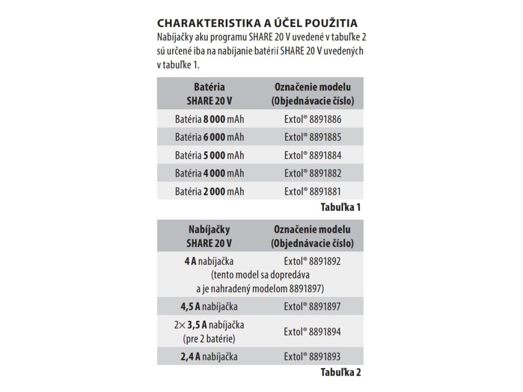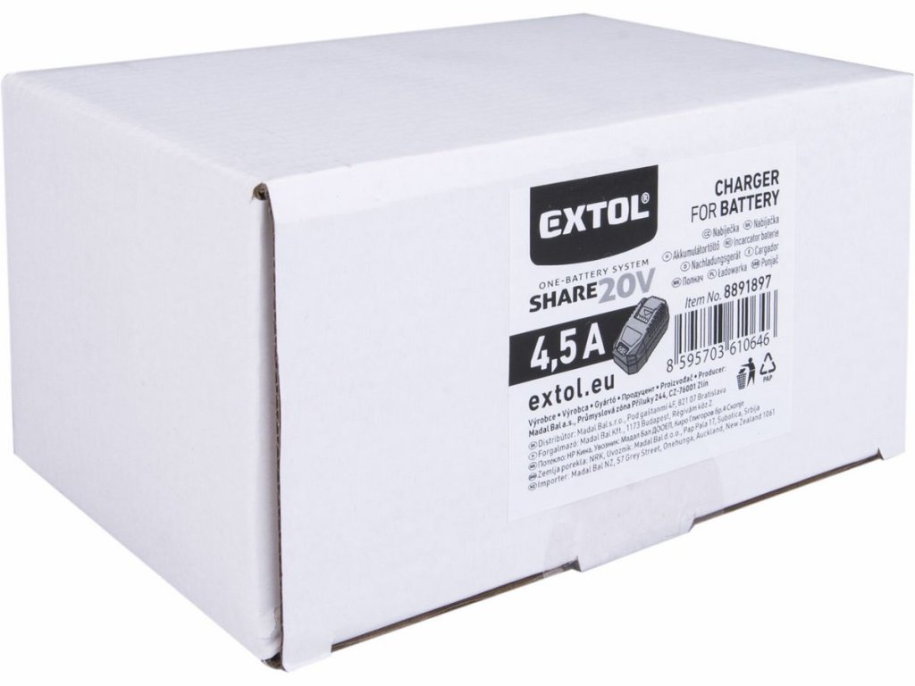 Nabíjačka Extol® slúži na nabíjanie akumulátorov z radu Extol SHARE 20 V. Ide o univerzálny nabíjací systém určený pre rôzne druhy akumulátorového náradia Extol®, ktorý umožňuje použitie jednej batérie pre viaceré typy zariadení tejto série.