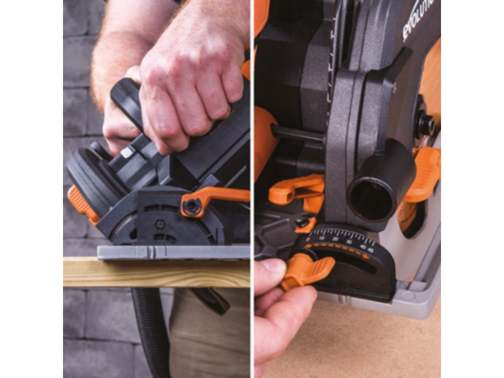 Flexibilitu pri práci okružnej píly EVOLUTION R185 CCSX zabezpečuje nastaviteľná hĺbka rezu až do 64 mm a možnosť úkosu v rozsahu 0°-45°. Ergonomicky tvarovaná rukoväť s príjemným povrchom minimalizuje únavu pri používaní.