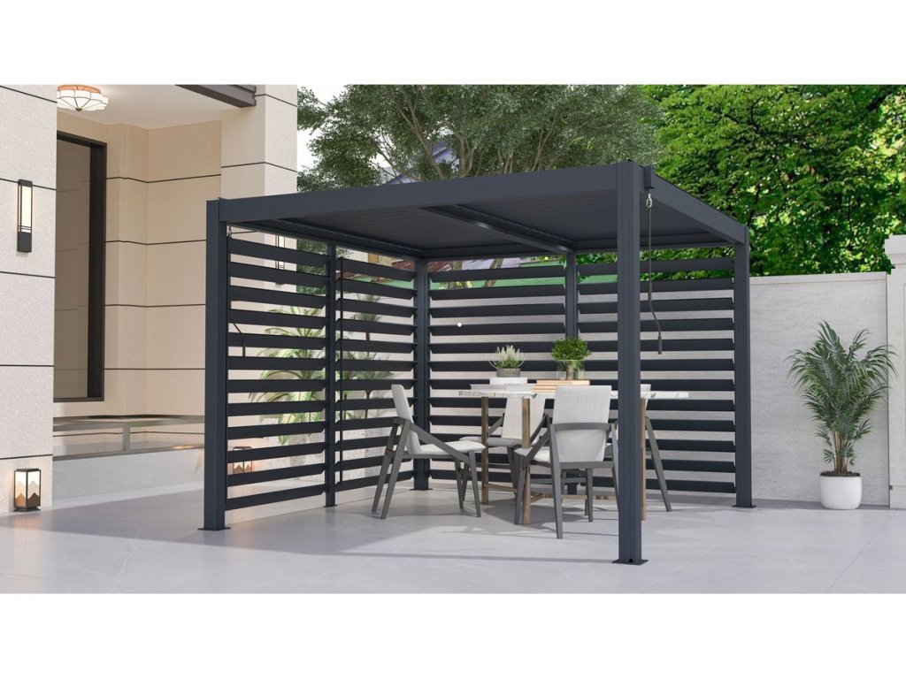 S antracitovým farebným prevedením bočná stena dokonale ladí s dizajnom pergoly G21 Austin a vytvára tak jednotný, moderný a elegantný vzhľad celého priestoru.