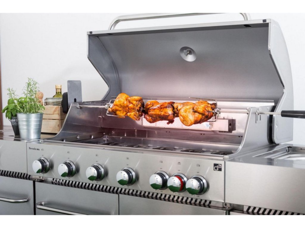 Mäso sa rýchlo „zatiahne" a vytvorí chrumkavú ochranú kôrku, ktorá udrží všetku šťavu vo vnútri. Horák je umiestnený horizontálne, takže tuk z mäsa nekvapká priamo na neho a nedochádza k jeho vzplanutiu. Motorová grilovacia ihla je súčasťou balenia, takže môžete ihneď začať grilovať celé kura alebo väčšie kusy mäsa.