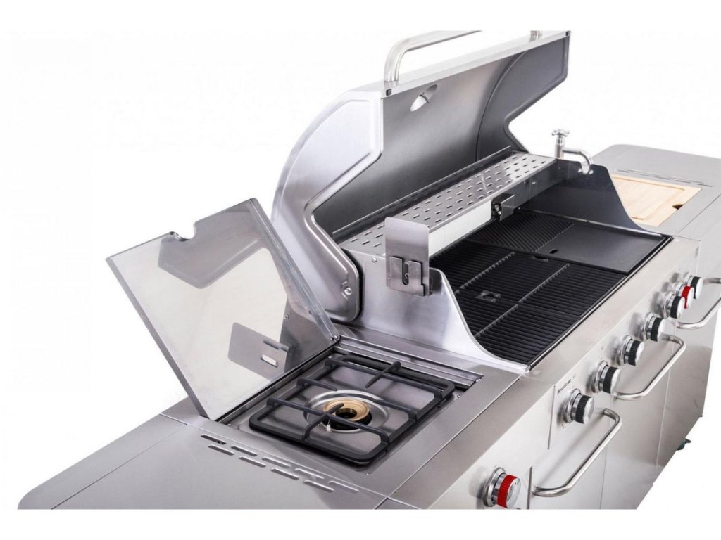 Celkovo gril ponúka výkon 32 kW, vďaka čomu zvládne aj veľké kusy mäsa, celé kura na motorovej ihle alebo grilovanie pre desiatky hostí naraz. Každý horák ovládate samostatne, takže si vyberáte, kde budete opekať steaky na vysokom výkone a kde pomaly dusiť zeleninu.