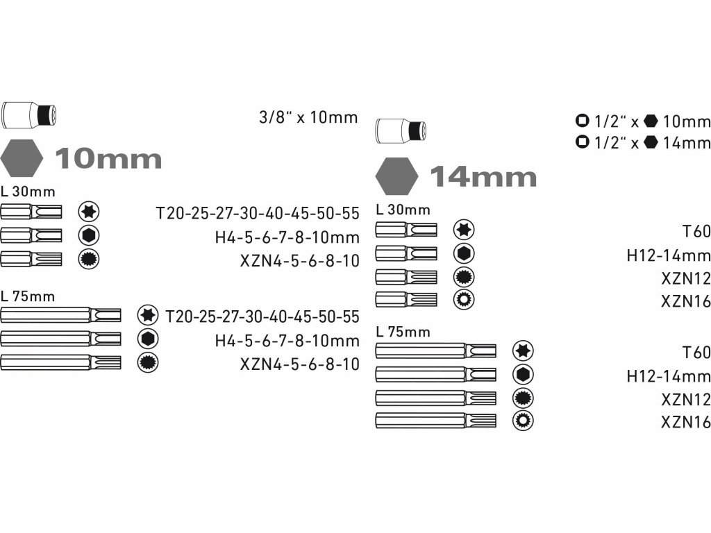 Sada obsahuje tri adaptéry (3/8"x10mm, 1/2"x10mm, 1/2"x14mm), ktoré umožňujú použitie bitov s bežnými račňami. Či už pracujete na aute, alebo sa venujete všeobecným opravám, táto sada vám poskytne potrebnú flexibilitu a presnosť.