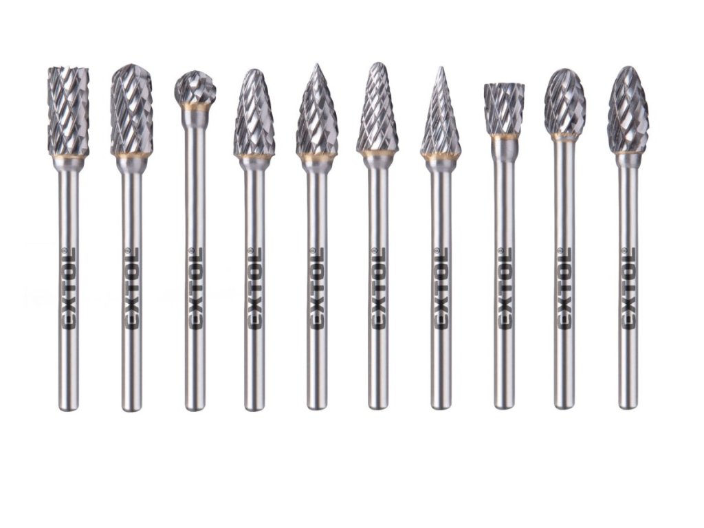 Sada karbidových fréz, 10ks, ø6mm, stopka ø3mm, celková dĺžka 50mm, EXTOL INDUSTRIAL