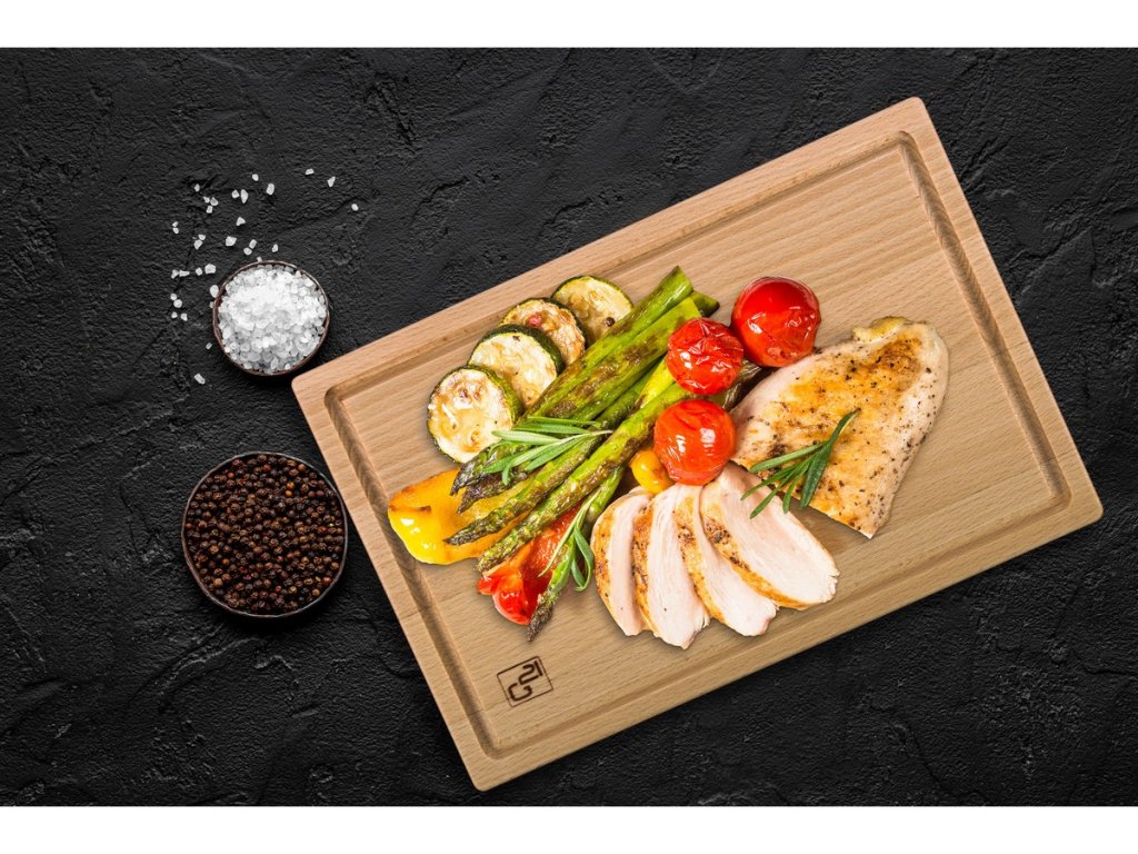 Dizajn s drážkou po obvode dosky prináša praktické výhody. Zachytáva šťavu z krájaných potravín alebo servírovaných pokrmov, čím udržuje vašu pracovnú plochu čistú a suchú. Tento prvok oceníte najmä pri krájaní šťavnatého ovocia alebo servírovaní šťavnatých mäsových pokrmov.