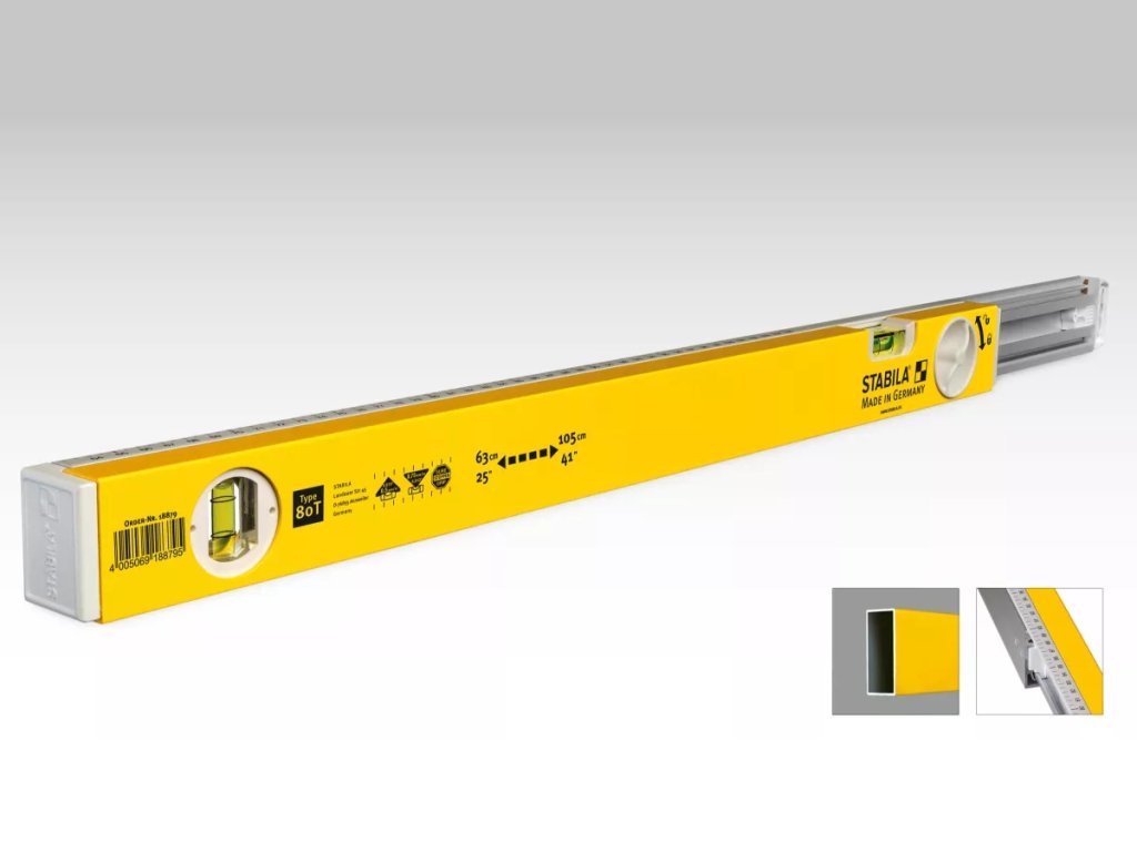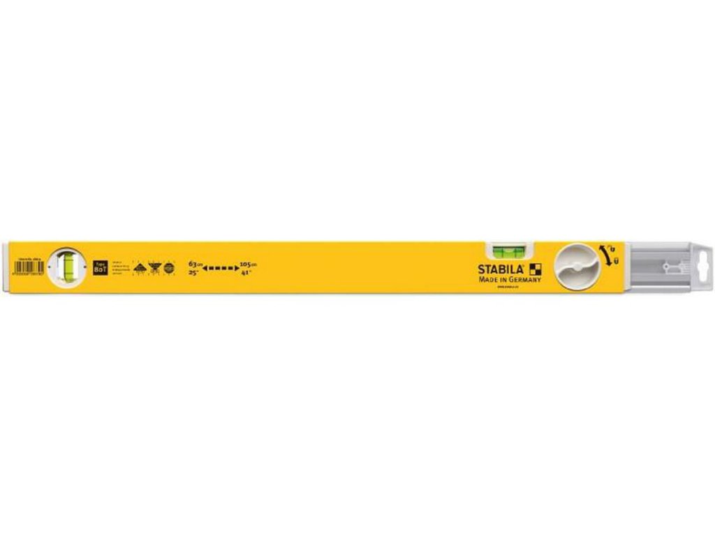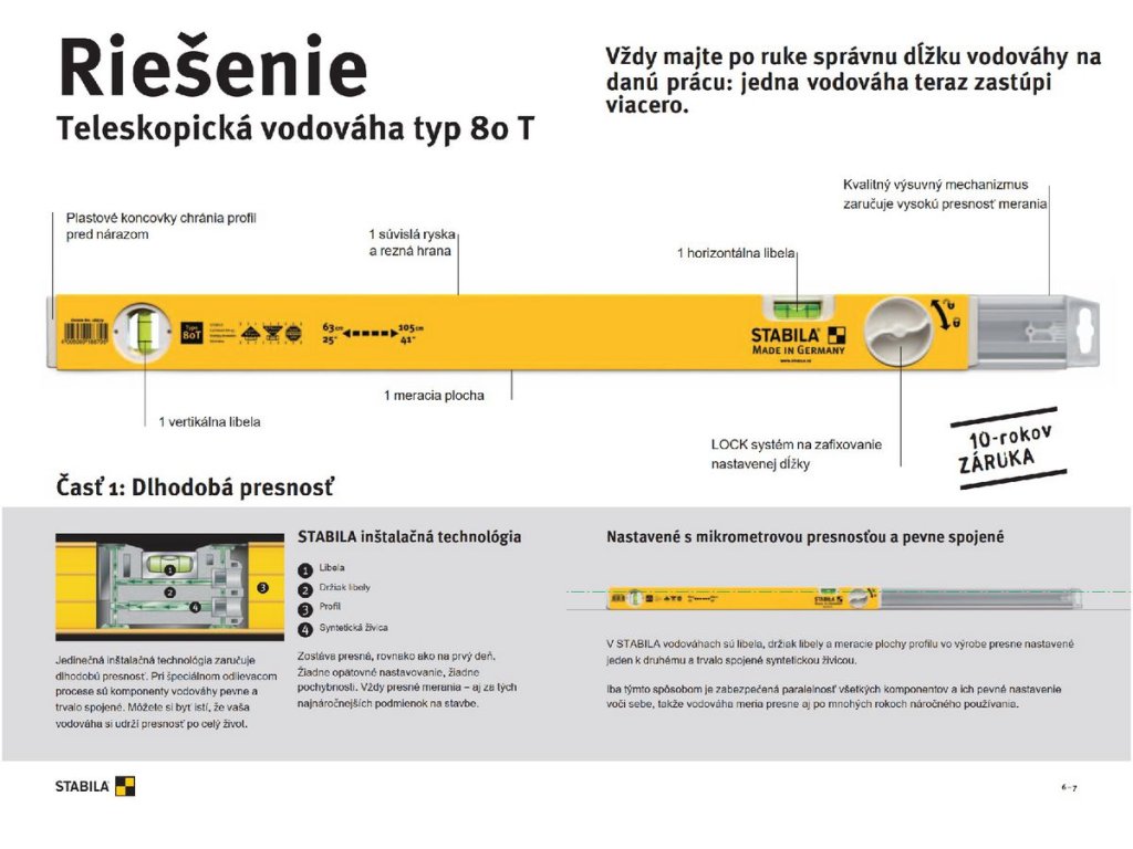 STABILA 80 T kombinuje vysokú presnosť s praktickými detailmi. LOCK systém udrží nastavenú dĺžku pevne zafixovanú, takže sa vodováha nepohne ani pri práci s ťažšími prvkami.