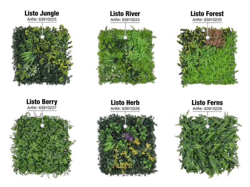 - Realistický vzhľad – husté listy, 3D štruktúra a kombinácie rastlín ako paprade, brečtan či tropické lístie