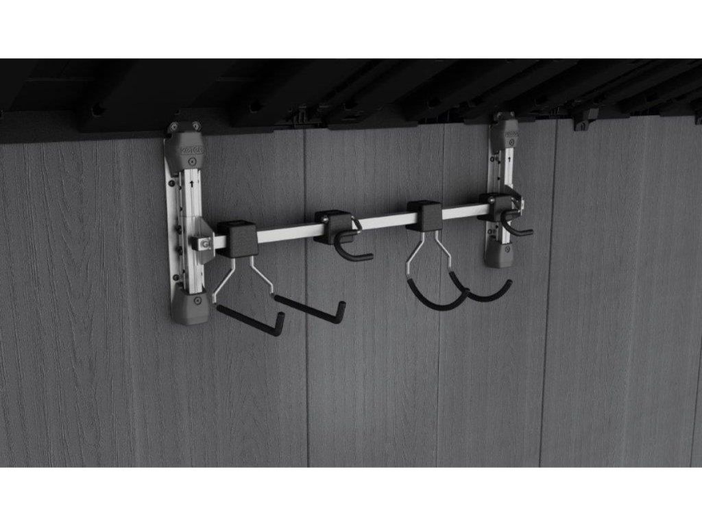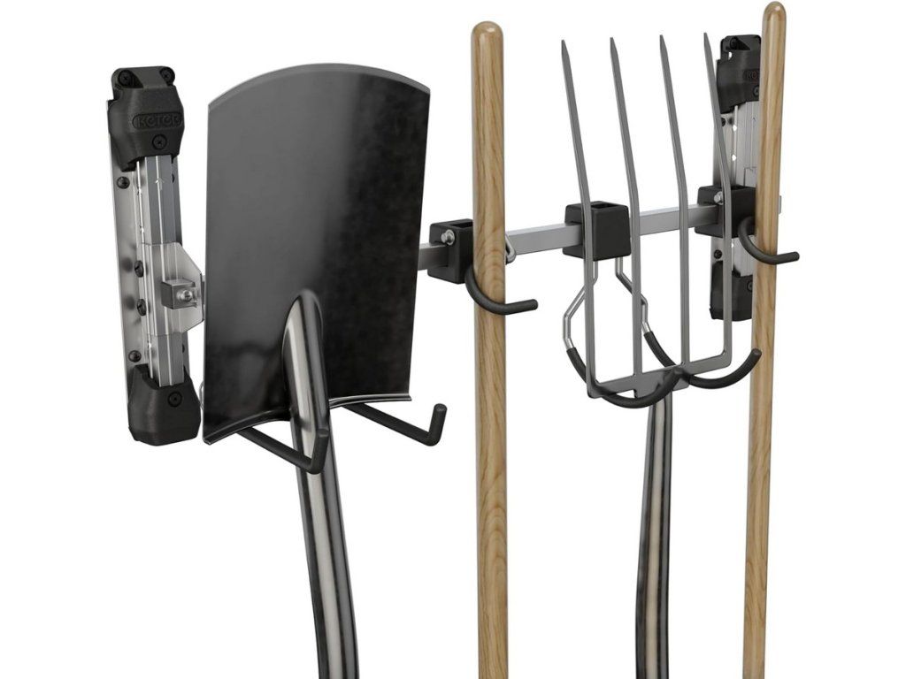 Lišta na náradie Keter Multi Purpose Wall Hanger disponuje štyrmi posuvnými hákmi, ktorých pozíciu si prispôsobíte presne podľa šírky vašich nástrojov. Bežné lacné vešiaky majú pevné rozostupy, takže ak máte širšiu lopatu, vedľajší hák zostáva nepoužiteľný.