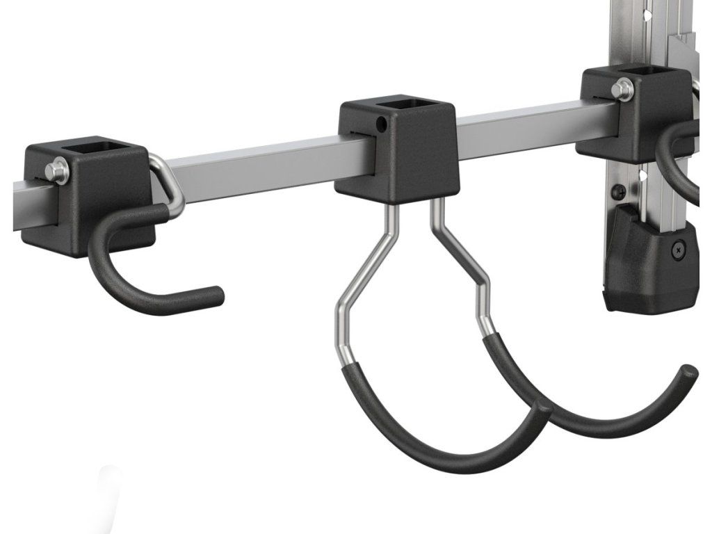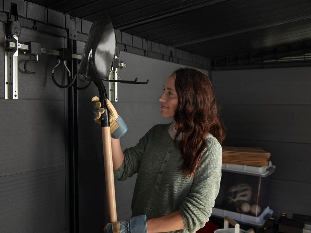 Tu stačí hák jednoducho posunúť a využijete každý centimeter nosnej lišty. Maximálna nosnosť jedného háku je 9 kg, čo s prehľadom stačí na záhradné náradie s dlhou násadou. Všetko drží plynulo, bez vôle a s pocitom absolútnej kontroly nad organizáciou priestoru.