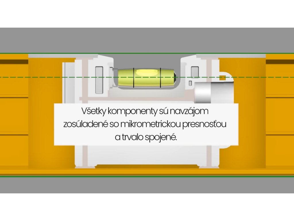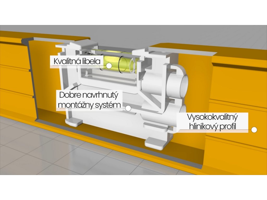 Hliníkový dutý profil je pevný a pritom ľahký, takže sa pohodlne nosí a nezavadzia. Presnosť merania dosahuje ±0,5 mm/m, čo je viac než dostatočné aj pre detailné práce okolo domu.