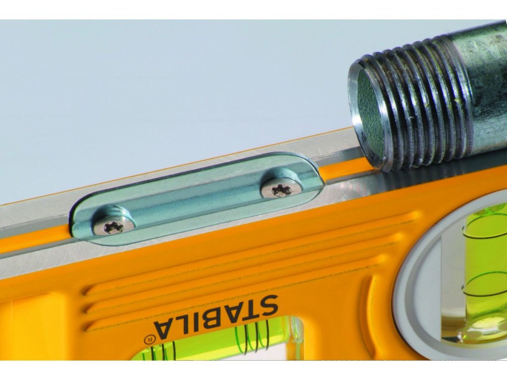 Frézovaná meracia plocha s V-drážkou zabezpečí pevné uchytenie aj na rúrach a valcových povrchoch, kde bežná vodováha často skĺzne.