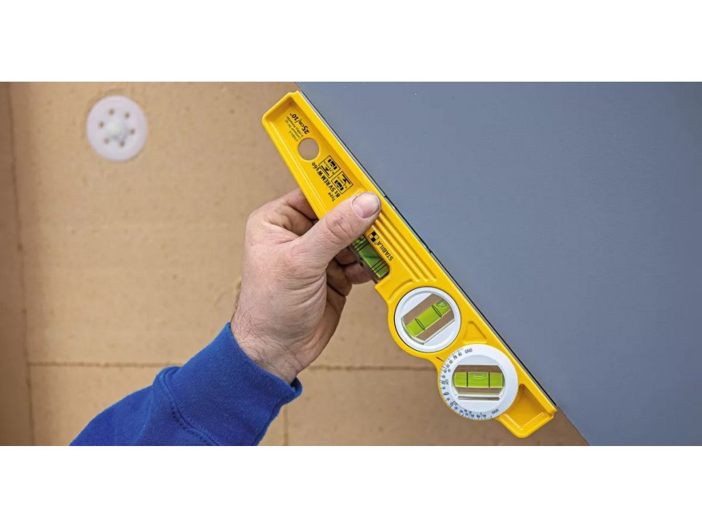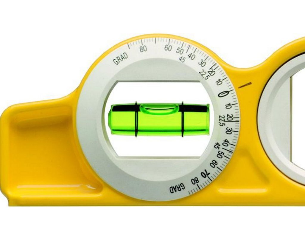 Model obsahuje tri libely – horizontálnu so sklonom 1 % a 2 %, vertikálnu a otočnú libelu, ktorú možno nastaviť na 360° alebo 45°. To umožňuje kontrolovať rôzne sklony a uhly, napríklad pri potrubiach alebo priehradových nosníkoch.
