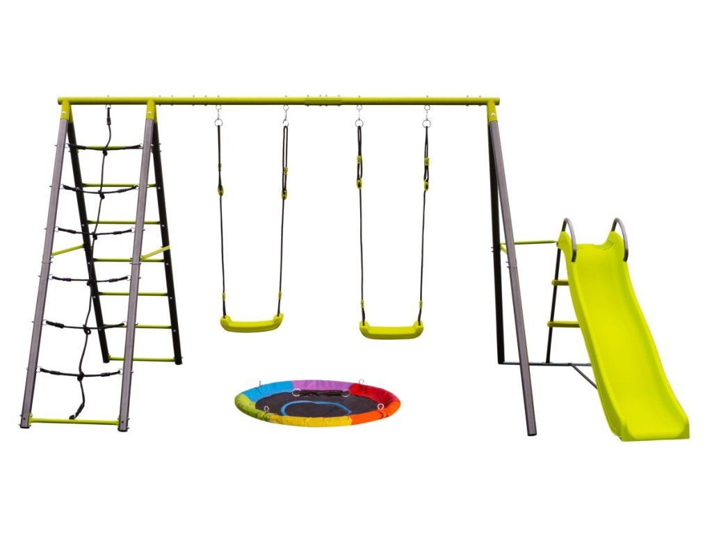- Kompletná výbava 4v1 obsahuje hojdačky, kruh, šmykľavku aj lezeckú sieť