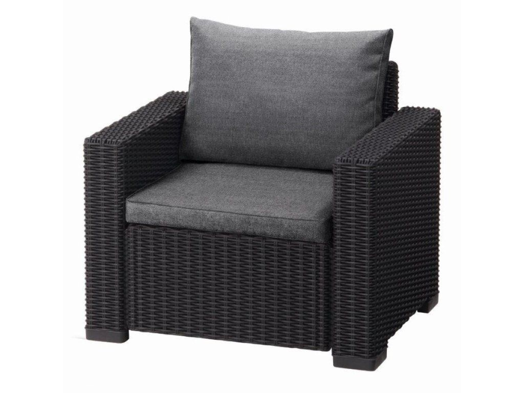 Kreslo stojí pevne na širokej základni, čím eliminuje kývanie na nerovnej dlažbe alebo trávniku. Ak hľadáte set k 2-miestnej či 3-miestnej pohovke z radu California, grafitový odtieň bude ladiť úplne presne.