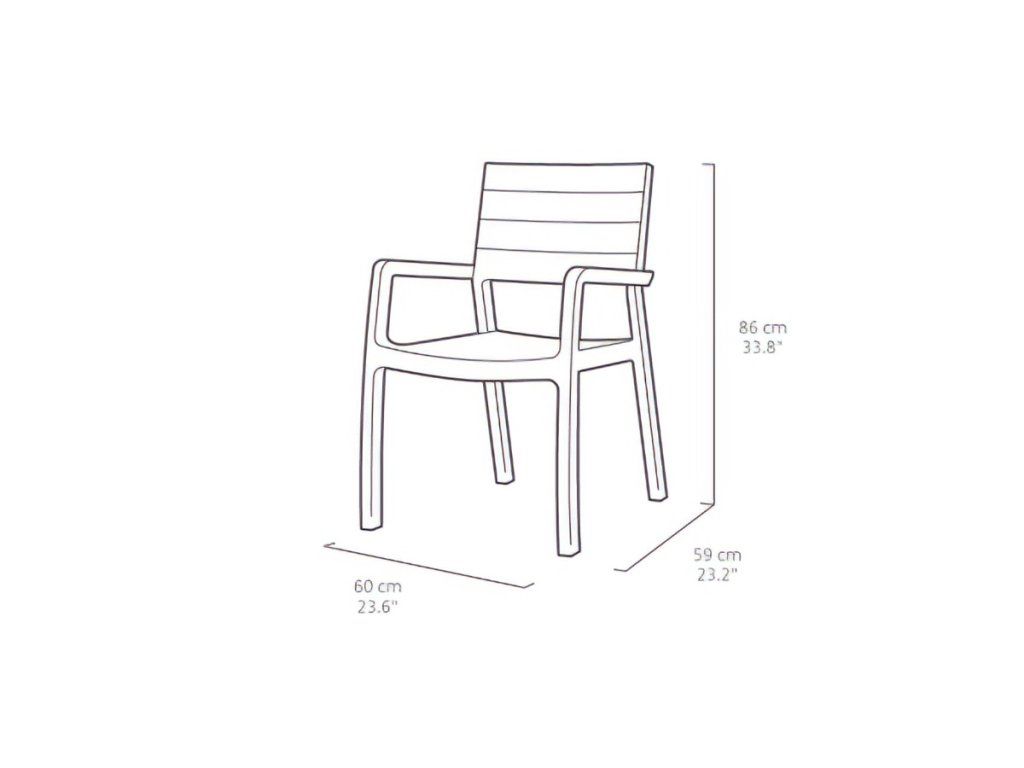 Výška 86 cm je presne kalibrovaná k stolu Harmony, ku ktorému sa pohodlne zmestí až 6 týchto kresiel s opierkami. Investícia do tohto nábytku sa vráti v podobe ušetreného času, ktorý by ste inak strávili údržbou prírodných materiálov.