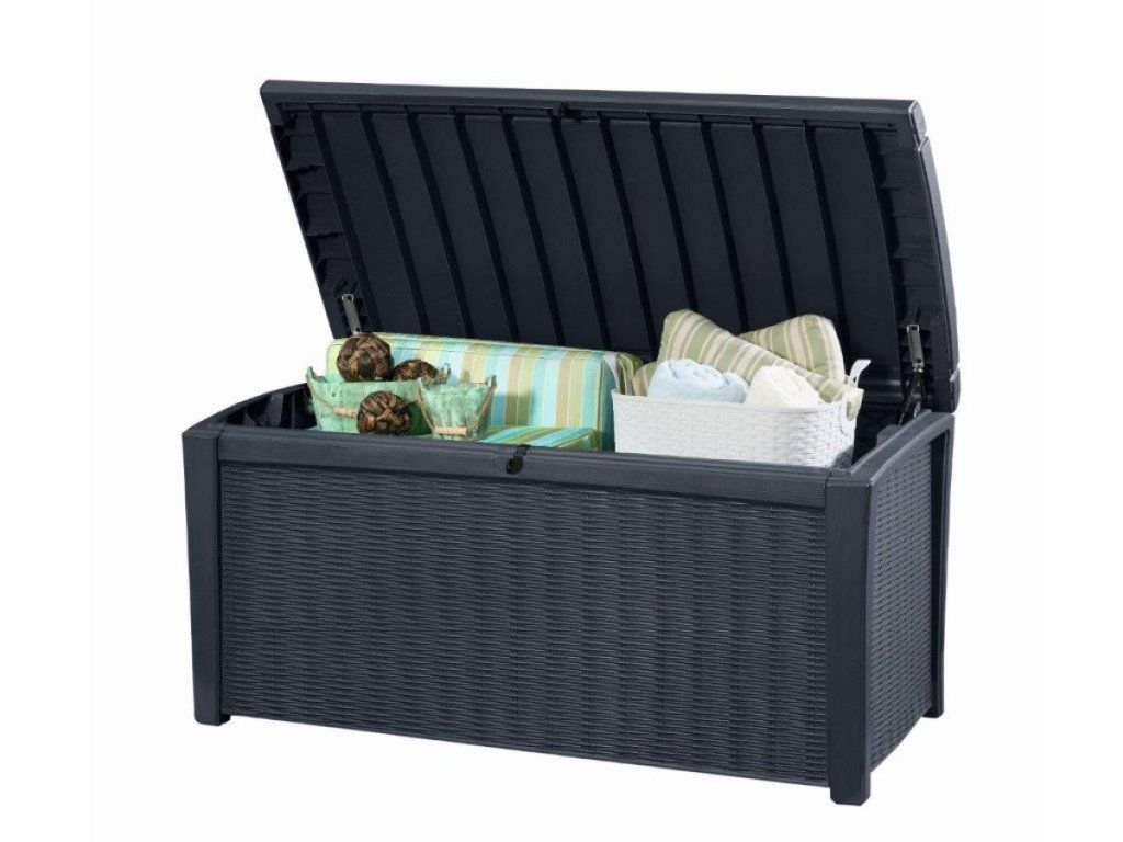 Záhradný úložný box Keter Borneo predstavuje nízkoudržbaové riešenie s objemom 416 l, ktoré je určené na ochranu záhradného náradia, textílií a hračiek pred nepriazňou počasia. Pevný plast s dizajnom ratanu v grafitovom odtieni nekoroduje a vďaka UV ochrane si zachováva svoju farbu aj na priamom slnku.