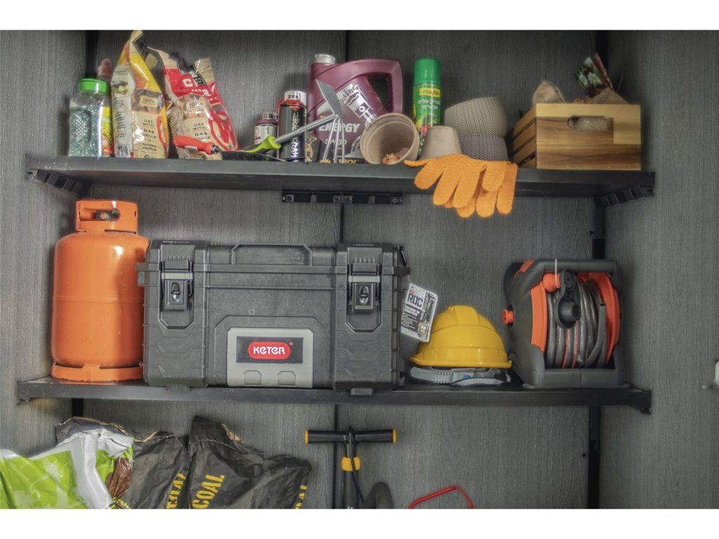 Vnútorný priestor rozdeľujú 2 police, ktoré sú súčasťou balenia, takže nemusíte nič dokupovať. Ak hľadáte riešenie na dvor, kde je málo miesta, táto skriňa nahradí malý záhradný domček za zlomok ceny.