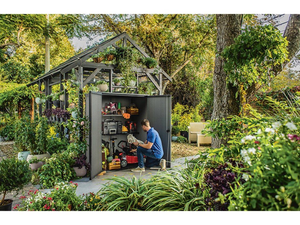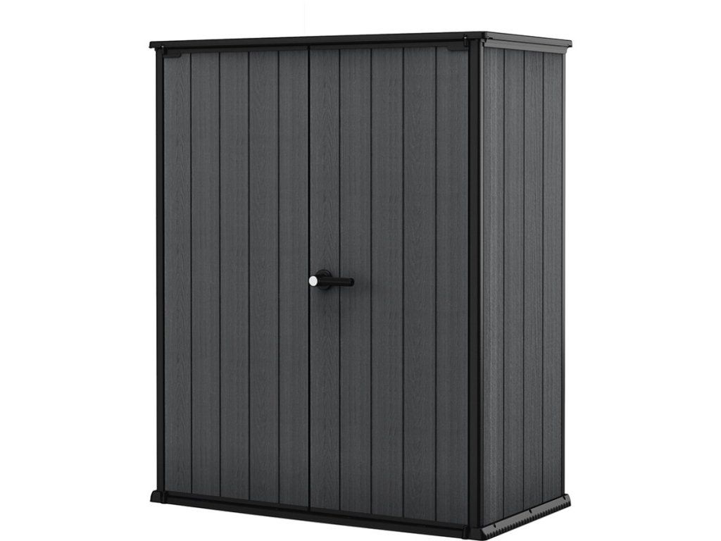 Plechové skrinky často hrdzavejú v spojoch a ich montáž pripomína nekonečné puzzle s ostrými hranami. Keter Cortina Alto s hmotnosťou 42 kg stojí stabilne na podklade a vďaka šírke 140 cm doň vojdete aj s rozmerným nákladom.