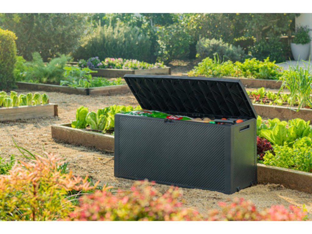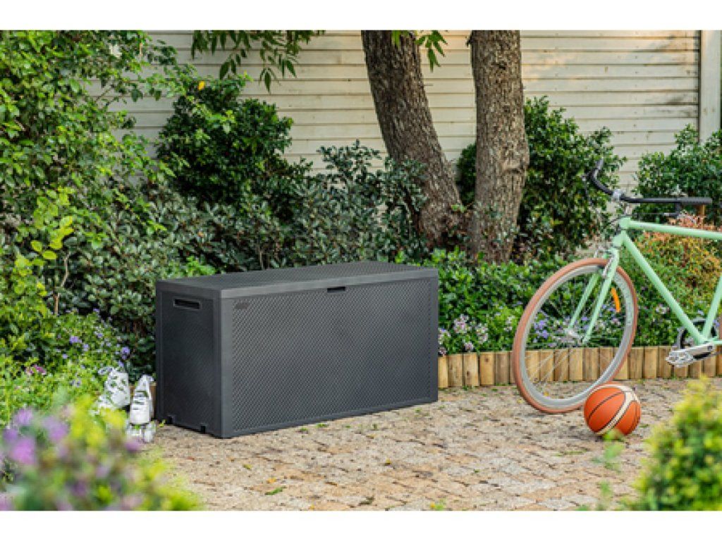 Grfitové farebné prevedenie a povrchová úprava pripomínajúca prírodné materiály zapadne do exteriéru bez toho, aby pôsobila rušivo. Keď sa večer ochladí alebo začne fúkať, nemusíte všetko prácne nosiť do domu. Jednoducho veci hodíte do boxu, zacvaknete veko a máte hotovo.