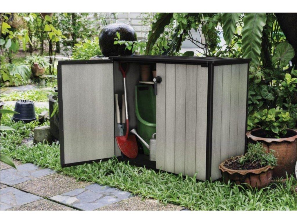 Záhradný úložný box Keter Patio Store s objemom 1 000 litrov určené na bezpečné uskladnenie záhradnej techniky, nábytku alebo odpadových nádob. Konštrukcia z materiálu DUOTECH™ zabezpečuje vysokú odolnosť, čím eliminuje potrebu pravidelného brúsenia či natierania.