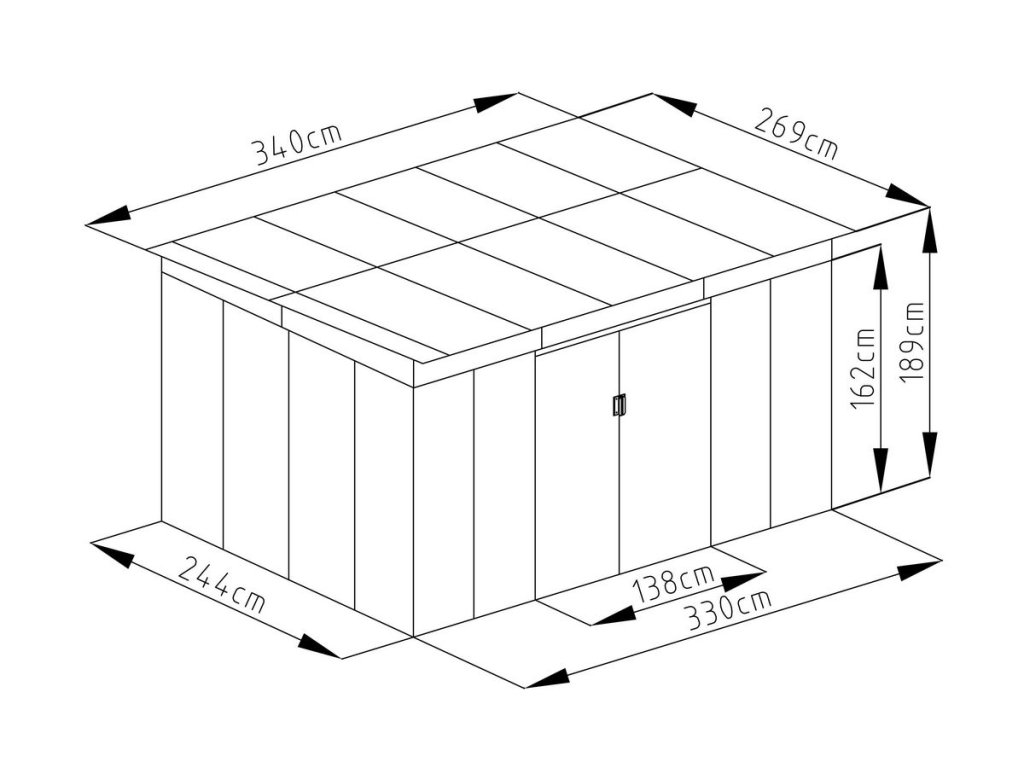 - Vonkajšie rozmery – so strechou (š x d x v): 340 x 269 x 189 cm