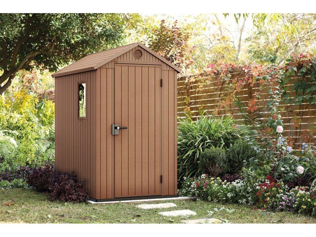 Záhradný domček Keter Darwin 4 x 6 v hnedej farbe prirodzene zapadne do každej záhrady. Jeho dizajn pripomína tradičné drevené domčeky, ale vďaka použitiu moderných materiálov ponúka oveľa vyššiu odolnosť a trvácnosť.