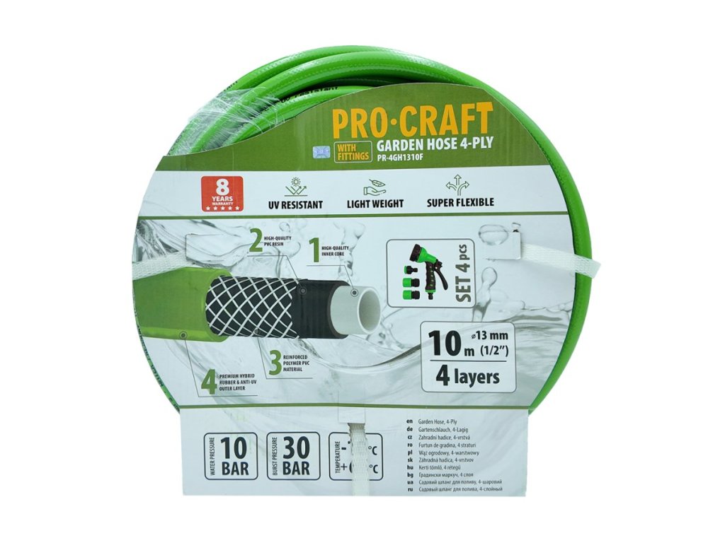 Základom každej udržiavanej záhrady je rozvod vody, ktorý vás nezradí ani pri maximálnom zaťažení. Záhradná hadica Procraft PR-4GH1310F disponuje zosilnenou 4-vrstvovou konštrukciou, takže hravo odolá aj hrubšiemu zaobchádzaniu na betóne či medzi kameňmi.